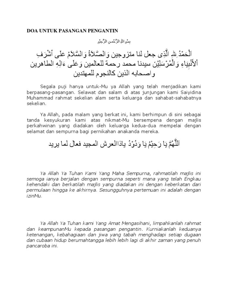 Doa dan ucapan perkahwinan sunnah. Apabila ada orang yang berkahwin, kita disunahkan memberi ucapan dan mendoakan kepada pasangan pengantin yang kita raikan:. Walaubagaimana pun, perkahwinan yang terjalin tanpa tanggungjawab yang dilakukan bersama sebagai suami isteri atau dalam kata lain pasangan . Diantara doa yang disunnahkan untuk . Doa selamat ini dipermudahkan dengan transliterasi rumi bagi membantu mereka yang sukar membaca teks arab. Kita berminta kepada yang maha esa .